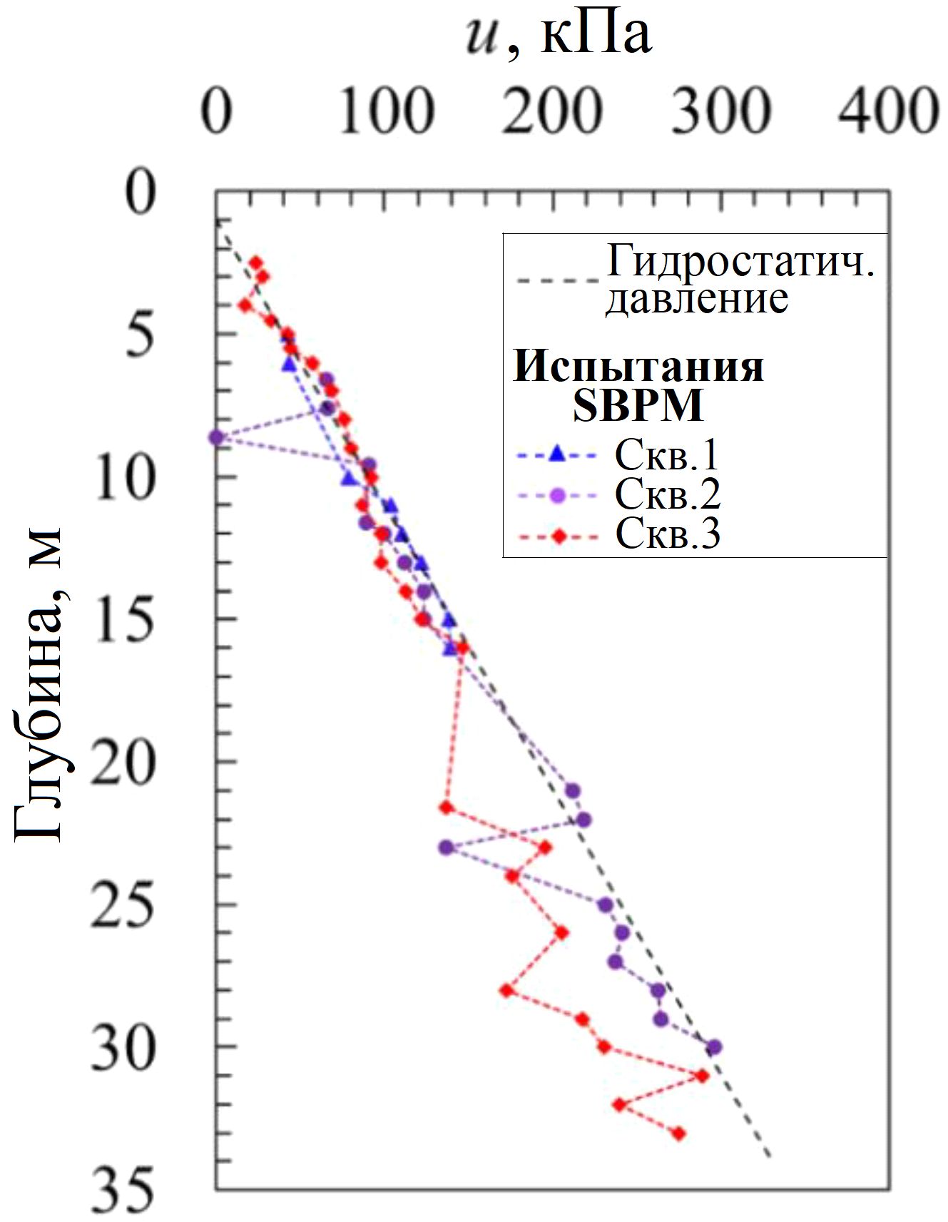 Рис. 7. Результаты определения порового давления воды с помощью испытаний самозабуривающимся пресиометром в скважинах 1, 2 и 3, сопоставленные с гидростатическим давлением