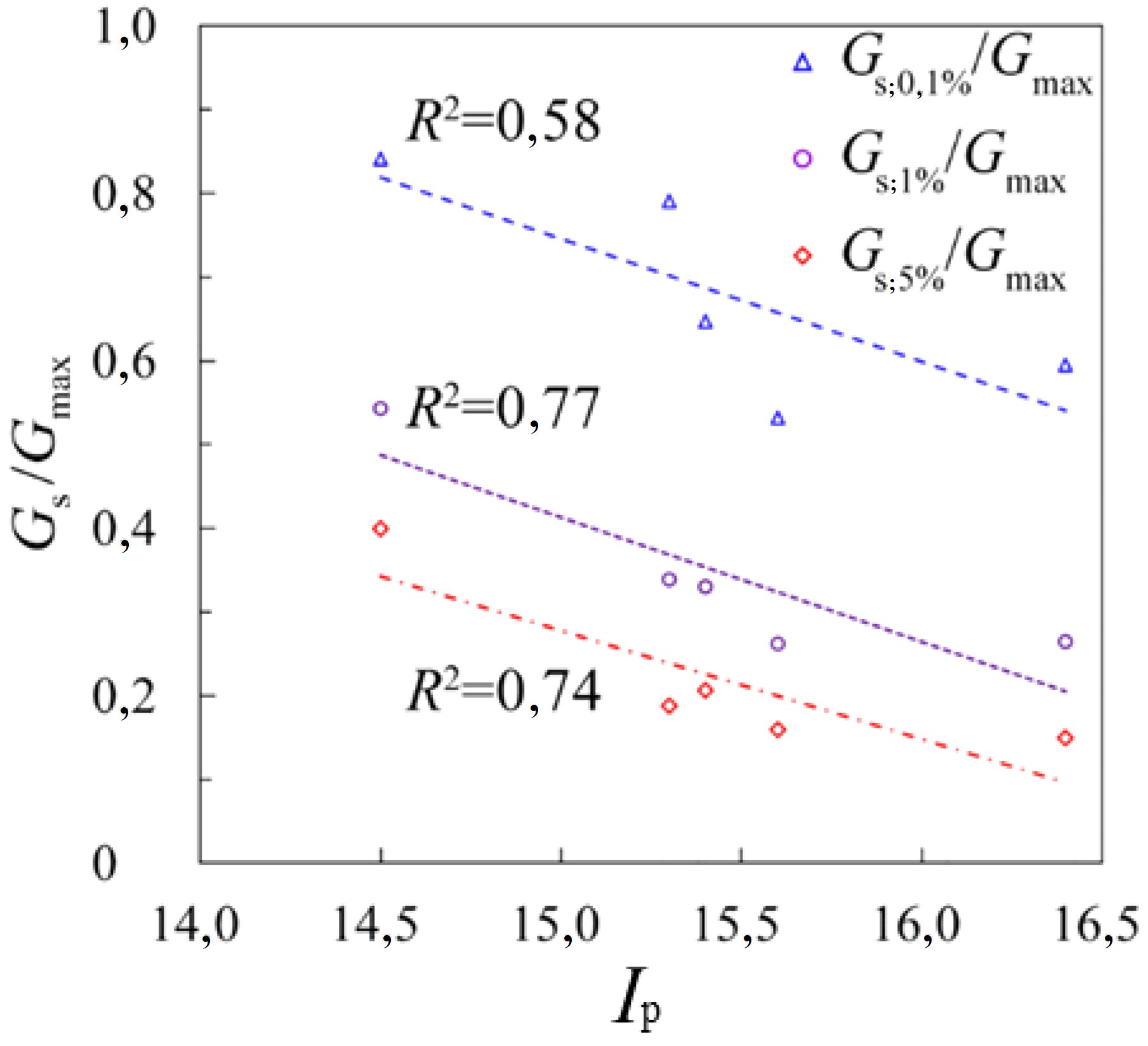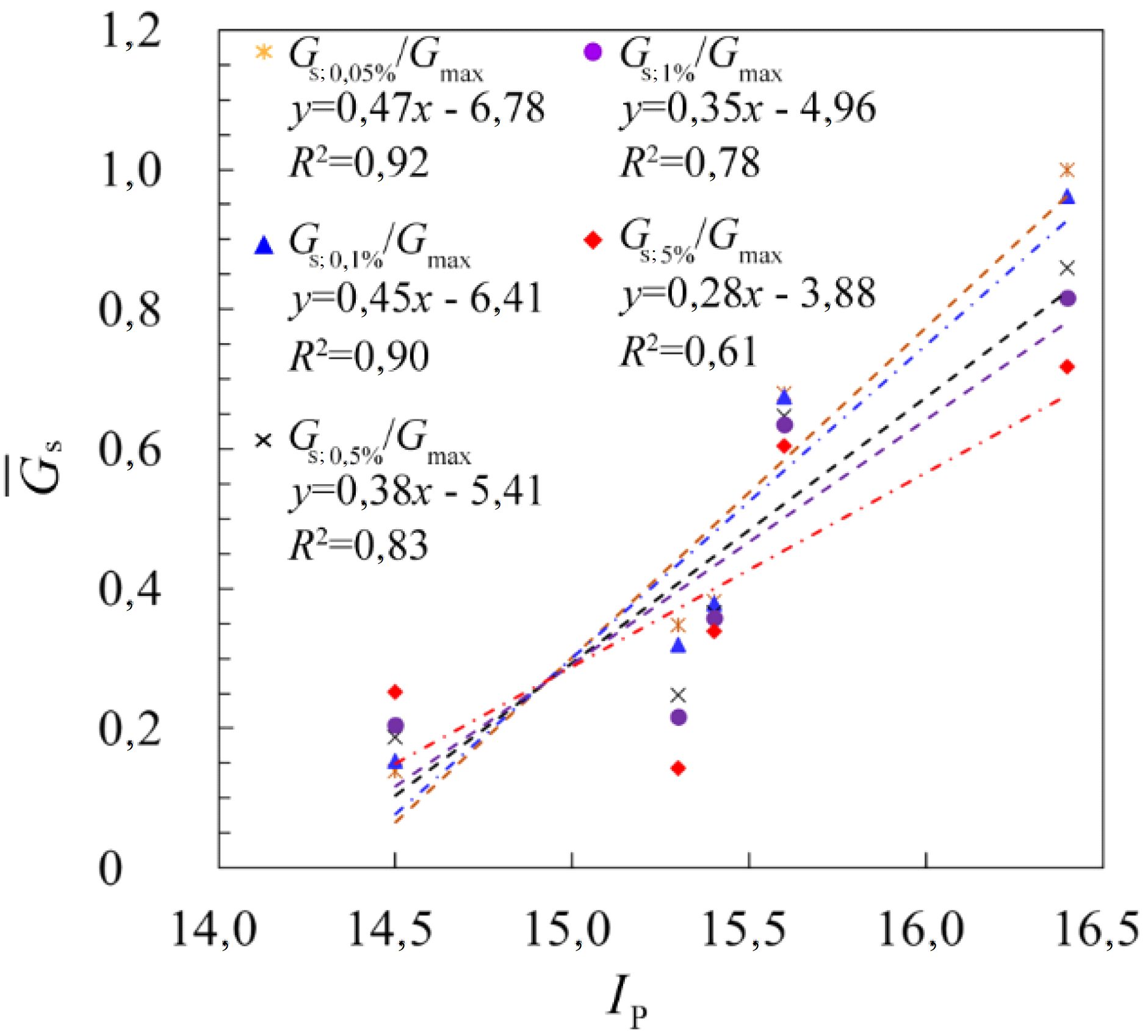 Во-первых, по мере увеличения числа пластичности нормализованный модуль сдвига (см. формулу (5)), который положительно связан с секущим модулем сдвига Gs, также увеличивается, что указывает на положительную связь между Ip и Gs. Другими словами, чем больше число пластичности Ip, тем выше секущий модуль сдвига Gs.
