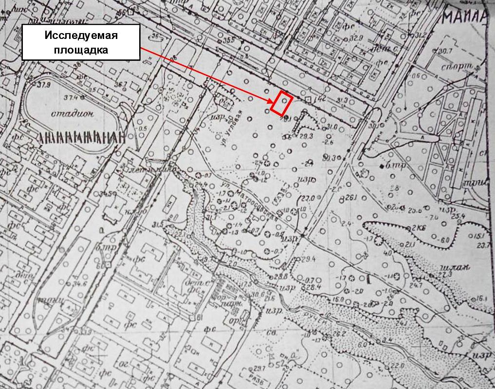 По материалам инженерно-геологической изученности прошлых лет, около 50 лет назад южнее изучаемого участка был овраг (в отчёте имелась топосъёмка) (рис. 4), пролегающий с северо-запада на юго-восток (с верховьем на северо-западе), с ручьем в тальвеге, ныне засыпанный. На месте изучаемого участка располагался зелесённый пустырь, местами изрытый и покрытый неглубокими ямами. Восточнее него параллельно оврагу располагалась яма приличных размеров, вытянутая в направлении участка, частично заполненная шлаком. Как видно, за последние 50 лет прилегающий ландшафт значительно изменился, но участок исследования как минимум столько же не подвергался существенным техногенным изменениям.