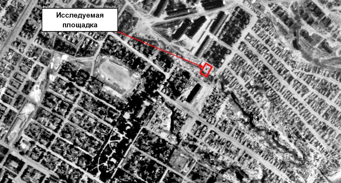 По материалам аэрофотосъемки 40-х годов (рис. 5), по южной половине исследуемого участка проходил овраг, который был почти полностью засыпан (судя по всему, шлаком, т.к. относительно недалеко располагалось металлургическое производство) и на топосъемке 60-х годов уже было видно несколько выемок на пустыре и ямы, частично заполненные шлаком. Точную его глубину определить невозможно, но даже 2-3 метра насыпного грунта под подошвой мелкозаглубленного фундамента (в лучшем случае — металлургического шлака), подстилаемого копившимся многие годы строительным и бытовым мусором (т.к. участок расположен по соседству с районом старой застройки и, скорее всего, овраги были локальным местом свалки мусора), при нагрузке от сооружения могут дать существенную для здания неравномерную осадку.