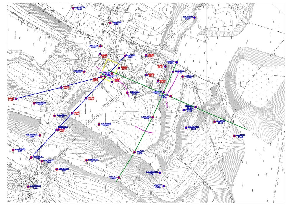 Рис. 1. Результаты топосъемки исследуемого участка. Желтая сплошная линия – контур проектируемого здания; зеленые сплошные линии – профили для расчетов устойчивости склона по данным изысканий прошлых лет; синие сплошные линии – современные профили; фиолетовые штриховые линии – оползнеопасные границы по архивным материалам; зеленая штриховая линия в нижней части пятна предполагаемой застройки – современная оползнеопасная граница. Синим цветом подписаны скважины по данным выполненных ранее изысканий, красным – современные скважины