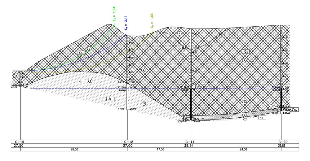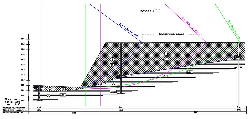 В совокупности все вышеперечисленные факторы геологического и гидрогеологического строения и дали неустойчивость склона у границ проектируемого пятна застройки даже без нагрузки, что было подтверждено данными расчетов устойчивости для одного из створов. И такие выводы были вполне прогнозируемы, так как расчет устойчивости для другого близко расположенного створа по данным изысканий прошлых лет дал в свое время аналогичные результаты.