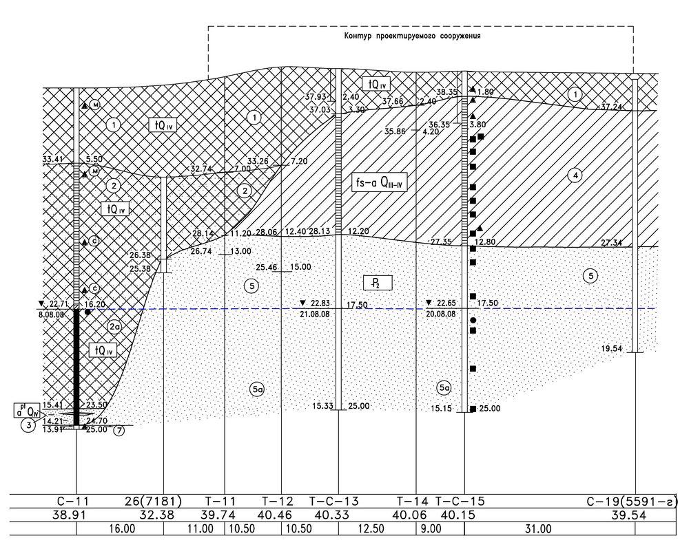 Рис. 4. Инженерно-геологический разрез, пересекающий пятно застройки будущего сооружения