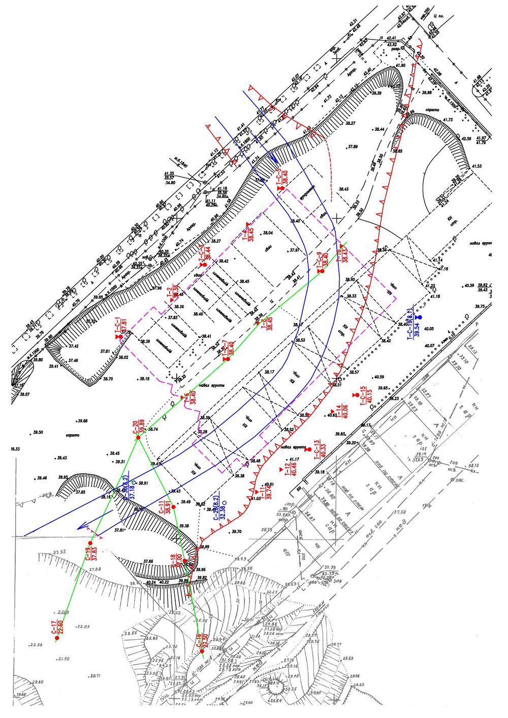 Рис. 5. Результаты топосъемки исследуемого участка. Фиолетовой штриховой линией показан контур проектируемого сооружения; синими сплошными линиями – границы ныне засыпанного русла реки, спрятанной в коллектор; стрелками – направление течения; красными зубчатыми линиями – контуры ныне засыпанных бровок долины реки; зелеными сплошными линиями – направление разрезов и профилей для расчетов устойчивости склона; красной штриховой линией – оползнеопасная граница. Красным цветом подписаны современные скважины, синим – скважины по данным изысканий прошлых лет