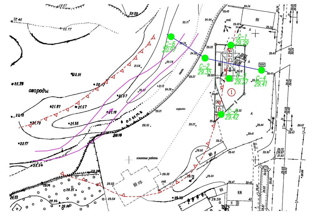 Рис. 6. Результаты топосъемкм исследуемого участка. Цифрой 1 обозначена группа проектируемых сооружений; фиолетовыми линиями показаны границы ныне засыпанного русла ручья; стрелкой – направление течения; красными зубчатыми линиями – контуры ныне засыпанных бровок долины ручья; зелеными кружками – скважины; синей сплошной линией – профили для расчетов устойчивости склона