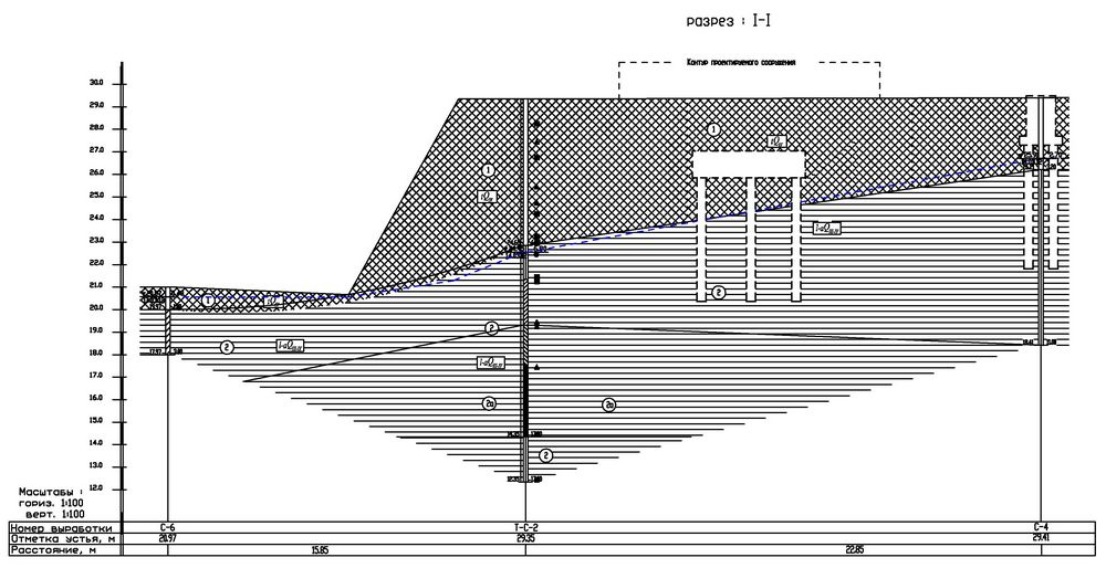 Рис. 8. Инженерно-геологический разрез I–I с грунтовыми сваями и подземной частью проектируемых сооружений