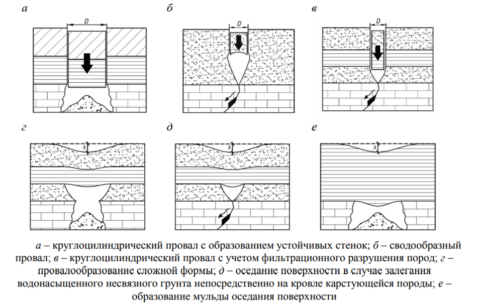 Рис. 1. Основные расчетные схемы деформаций основания под влиянием карстово-суффозионных процессов