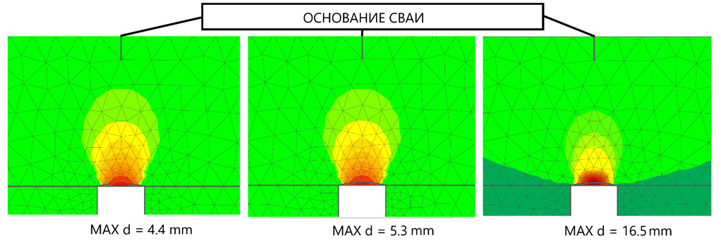 На рисунке 5 показан результат расчета с учетом максимально возможного размера полости 2 м. Максимальные деформации перемещения сваи при этом составят 6,5 мм.
