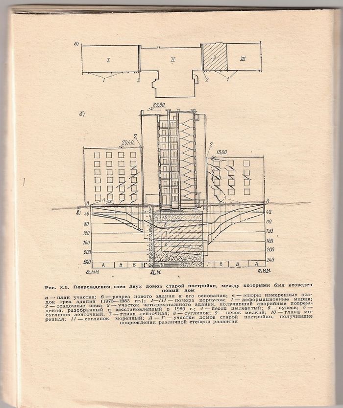 Уже построенное сооружение имеет большую жесткость, поэтому даже его малые неравномерные осадки и деформации могут привести к трещинам в надфундаментных конструкциях. Это особенно заметно при воздействии новостройки на старую застройку (рис. 1, 2).