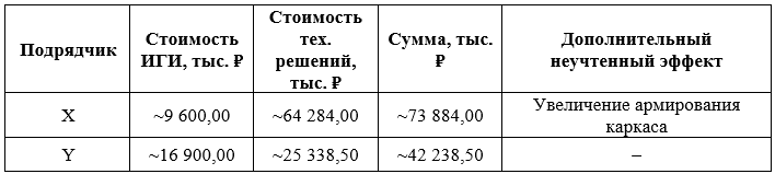 В таблице ниже приведено сравнение стоимости технических решений фундаментов по отчету ИГИ Подрядчика X и Подрядчика Y на одну высотную секцию.