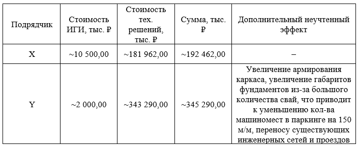 Табл. 2. Сравнение стоимости технических решений фундаментов по отчету ИГИ Подрядчика X и Подрядчика Y