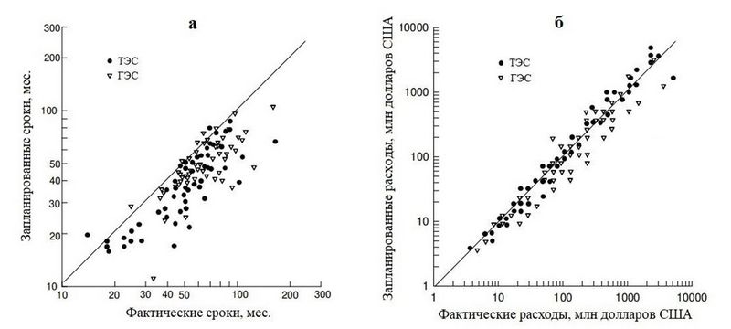 Рис. 3. Сопоставление изначально предполагавшихся и фактических сроков выполнения (а), а также сметных и итоговых общих затрат (б) при строительстве 125 энергетических объектов в развивающихся странах. Прямые линии соответствуют точкам равных запланированных и реальных сроков или затрат (по [5, 6])