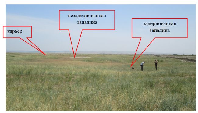 Рельеф района исследований отличается высокой степенью выположенности поверхности. Для нее характерен плоскозападинный микрорельеф с небольшими колебаниями относительных высот, и в условиях крайней засушливости даже незначительные неровности могут играть по конфигурации и размерам неглубокие депрессии (плоскодонные западины, степные блюдца и т.п.). Западины – небольшие депрессии, имеющие незначительную глубину, пологие склоны и плоское или очень слабовогнутое дно. Западины в форме блюдца представляют собой продукт суффозионно-просадочного и суффозионно-наносного генезиса. Отмечается два вида западин – задернованные и незадернованные (рис.4).