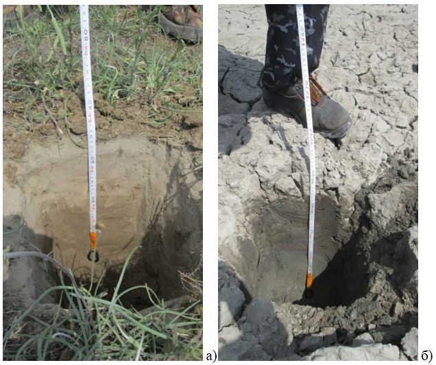 Рис. 6. Шурфы в центре западин: а) задернованная западина; б) незадернованная западина