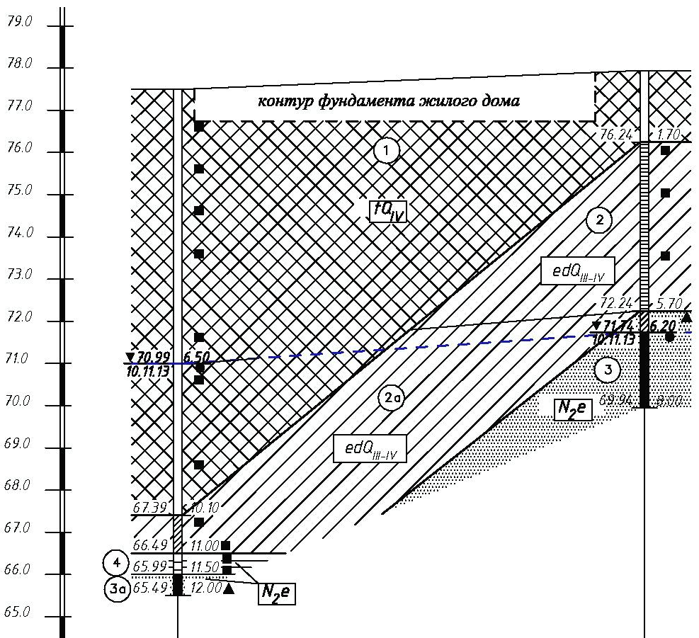 Рис. 9. Инженерно-геологический разрез площадки расположения рассматриваемого дома (цифрой 1 в кружке отмечен инженерно-геологический элемент, сложенный насыпными грунтами)