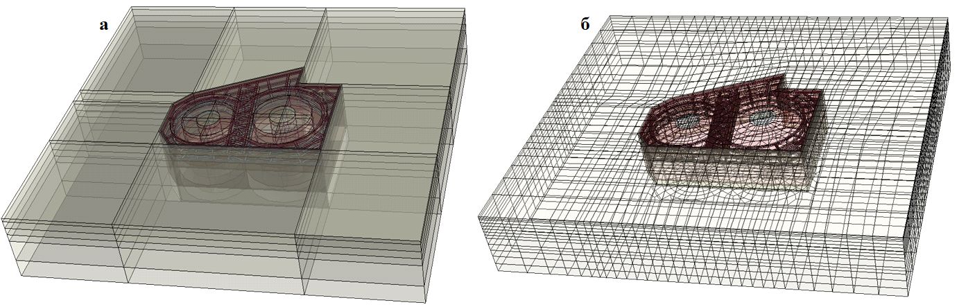 Рис. 1. Конечноэлементная модель (а) и сетка конечных элементов (б)