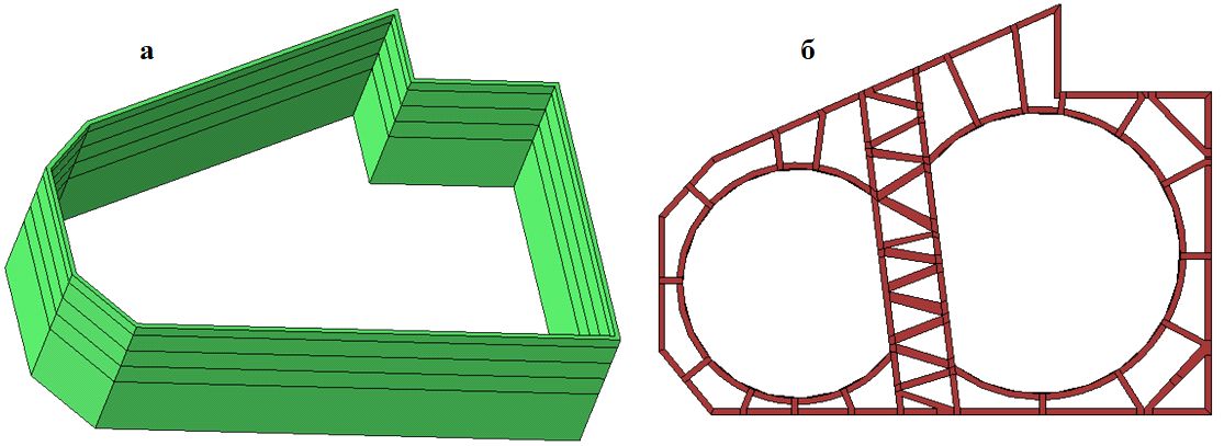 Рис. 2. Конечноэлементные модели «стены в грунте» в объеме (а) и системы ее крепления в плане (б)
