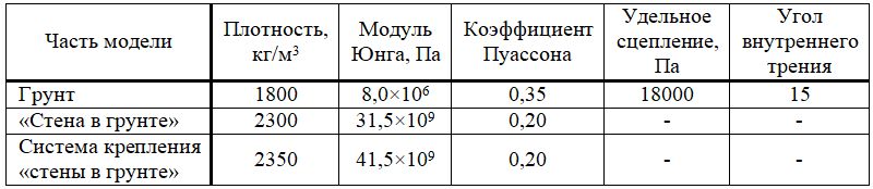 Длина, ширина и высота разработанной модели грунта составляют 213, 190 и 36 м соответственно, глубина котлована – 14 м, высота «стены в грунте» – 26 м. Система крепления правой и левой частей котлована в основном состоит из четырех обвязочных поясов из обвязочных балок, распорок и раскосов. Дно котлована принимается фиксированным. Грунт, «стена в грунте» и система ее крепления разделены на объемные блоки и шестигранные конечные элементы (рис. 1, 2). Грунт разделен на 30000 конечных элементов. Для него принята упругопластическая модель, а для «стены в грунте» и системы ее крепления – идеальная линейно-упругая модель. Параметры конечноэлементного моделирования приведены в таблице.