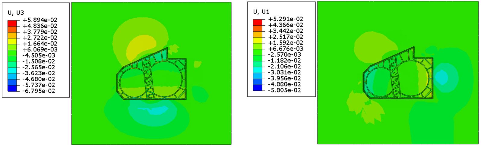 Рисунок 4 отражает горизонтальные смещения поверхности грунта после откопки котлована. Максимальное горизонтальное смещение за пределами котлована составляет 3–5 см, при этом грунт склонен к горизонтальным смещениям за более длинными в плане участками «стены в грунте».