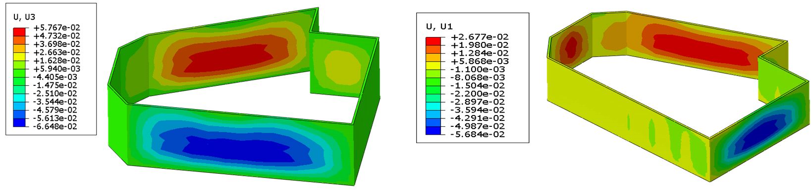 На рисунке 5 показаны горизонтальные смещения «стены в грунте» после откопки котлована. Она преимущественно деформируется посередине, причем величины деформаций наиболее велики на самой длинной в плане стороне стенки.