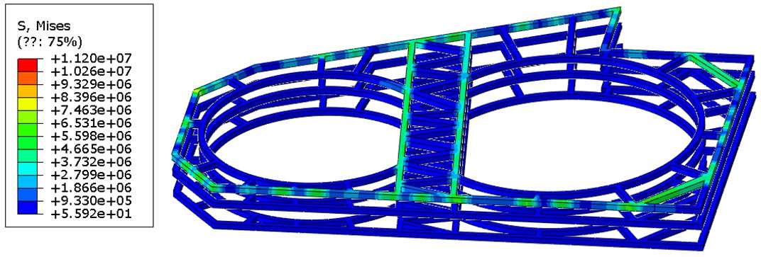 Было проведено конечноэлементное моделирование этапов строительства котлована при «островной» выемке грунта с «двухкольцевой» системой крепления подпорной стенки из четырех (в основном) обвязочных поясов из обвязочных балок, распорок и раскосов.
