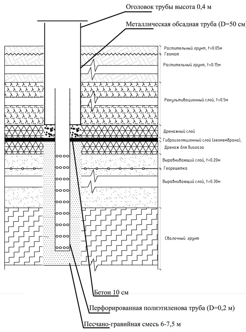 Скважины для пассивной дегазации монтируются после закрытия полигона (рис. 2), путем устройства буровых колодцев диаметром 50 см до отметки 6-7,5 м от поверхности рекультивированного полигона, в которые помещается перфорированная полиэтиленовая (или поливинилхлорида, полипропилена высокой плотности, стеклопластика) труба, диаметром 20 см. Пространство между трубой и стенками скважины послойно заполняется песчано-гравийной смесью с послойным уплотнением, с крупностью скелетной фракции 20-40 мм и с минимальным количеством пылевых частиц (не более 10%), с содержанием карбонатов менее 10%, до отметки – 0,75 м, бетоном до отметки – 0,65 м. Перфорация выполняется сверлом 18 мм по окружности через каждые 600 мм, отверстия расположены в шахматном порядке на расстоянии 50-100 мм друг от друга.