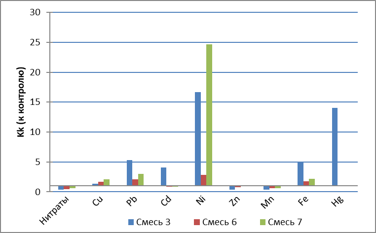 Рис. 5. Коэффициенты концентрации содержаний тяжелых металлов и NO3- в биомассе укосов травосмесей 3, 6 и 7 по отношению к контрольной пробе