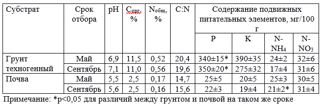 Известно, что пригодность субстратов в качестве плодородного грунта для продуктивного роста растений определяется прежде всего их агрохимическими свойствами. В этой связи были проведены исследования грунтов техногенных, используемых в эксперименте в качестве плодородного слоя, которые позволили дать его агрохимическую характеристику (табл.1).