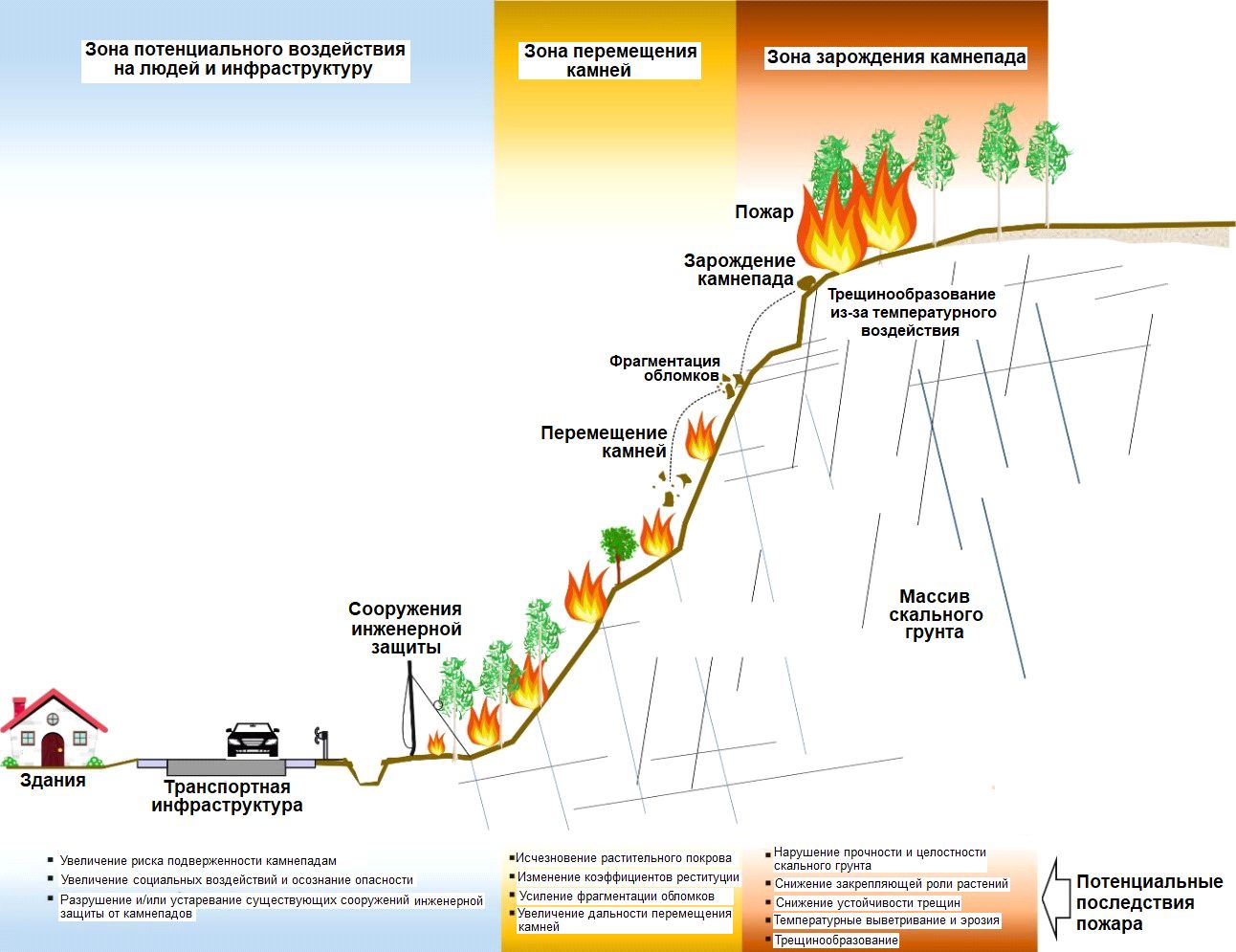 Лесные пожары могут вызывать физические и химические изменения в массивах скальных грунтов, увеличивая их фрагментацию и уменьшая их прочность в местах нарушений сплошности, что повышает частоту возникновения и интенсивность камнепадов. А из-за уничтожения пожаром растительного покрова изменяются траектории и дальность перемещения камней.