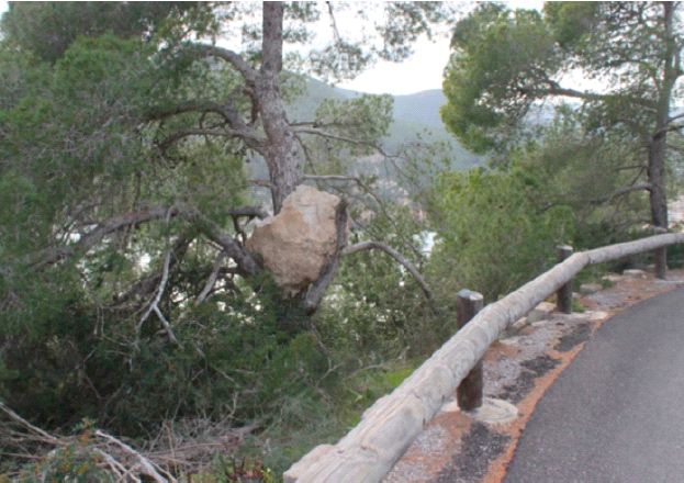 Рис. 2. Блок скальной породы, «пойманный» сосной во время камнепада на курорте Кала-де-Сан-Висент на острове Ибица в Испании