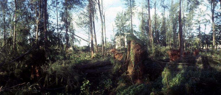 В 15.15 западный ветер слегка ослаб, деревья чуть выпрямились, стала просматриваться школа и 5-я авенида. В 16 ветер потерял былую силу, всё ещё гудит, но слабее, направление его стало юго-западное. Это как едешь очень быстро на машине, потом чуть сбавишь скорость, а кажется, что машина еле движется… Так и ветер: кажется – утих, но струи дождя летят всё ещё почти горизонтально. Но уже выпрямляются деревья, приводя в порядок поломанные кроны, а пальмы – растрёпанные до ниток листья. Плантация бананов в усадьбе напротив наших окон имеет жалкий, потрёпанный вид, и листья полуметровой ширины превратились в пучки сантиметровых полосок, уставшие растения не в силах выпрямиться (рис. 2). В 17 ветер на 20 минут усилился, полил сильный дождь, но полосы дождя ниспадают уже наискосок к земле. Под окнами стоит сплошная лужа воды. Небо – серое месиво, но уже с несколькими более светлыми полосами. В 18 начинает темнеть, во всём посёлке – ни огонька: электричество отключено, не работает холодильник, нет воды. Но в 18.20 зазвенели цикады: учуяли перемену погоды. В окнах появились слабые огоньки: запасливые земляки жгли свечи.
