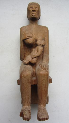 24 декабря начал резать первую скульптурку – фигура женщины с ребёнком, Берег Слоновой Кости, сенуфо. По замыслу придумал название: «Будет жить!»: ребёнок так присосался к материнской груди, что за счёт своих губ почти висел в воздухе (рис. 1). А накануне потерпел неудачу: при работе сломал наполовину вырезанную фигурку кпели, Мали, догоны – из дерева акана.