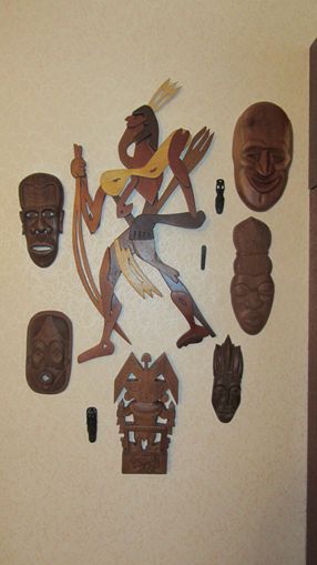 Маски не только резал, но иногда и покупал, но свои изделия нравились больше, хотя они не всегда удавались, особенно фигурка «Будет жить!». Изредка удавалось купить отличные: кажется, из Перу знакомые лётчики привезли за 5 долларов фигуру индейца-охотника, собранную из деталей разных по окраске и фактуре видов древесины, которая дома на стене стала ядром экспозиции масок. На каждой её детали с обратной стороны была наклеена написанная от руки этикетка с названием дерева, из которого резалась (рис. 2).