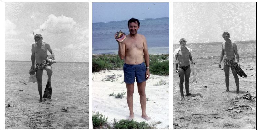 31 мая. В половине шестого выехали на охоту за ракушками на Плайю Ларга (длинный пляж) – это по западному берегу залив Кочинос почти до берега Карибского моря, напротив Плайя Хирон (через залив). Дорога, начиная от посёлка Плайя Ларга и около 20 км к морю – просёлочная, без асфальта, но сухая, раскристаллизированный калькаренит; справа вдоль дороги идёт низенький, с полметра деревянный частокол – для защиты от кабанов и крокодилов, которые могут забрести сюда из болот полуострова Сапато («ботинок»). Правда, мы ни одного зверя ни по дороге, ни за полдня пребывания на месте не видели. Народу было мало: я, Женя Ефименко да трое кубинцев. Остановились в таком месте, где было множество «развёрток», я «домой» – в посёлок Флорес привёз 11 штук (рис. 3), а более 20 выбросил обратно в море сразу после подъёма: были старые, поросшие водорослями, как мхом.