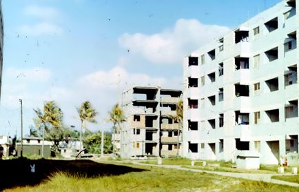 По заведённому обычаю новичков временно, а одиноких – на постоянной основе селили на первых этажах жилых домов, пока не освободится квартира повыше. При этом холостяки, и мужчины, и женщины, никогда не вселялись по одному, только «общежитием». Посёлок советских специалистов Флорес (в Гаване, кроме Флореса, их было несколько: Наутико, Коронелла, Аламар, некоторые специалисты постоянно жили в гостинице Фокс) был застроен типовыми 5-этажными домами. Нам поначалу досталась трёхкомнатная квартира на первом этаже в одном из домов «Эспосос» (супруги), прозванных кубинцами за то, что стояли входами навстречу друг другу, а не «в затылок» (рис. 2). Здесь на первом этаже мы прожили до марта следующего года, затем переселились на третий этаж в соседнем ряду домов (С-3), тоже в 3-комнатную квартиру площадью 65 м2 – больше, чем осталась у нас в Союзе (рис. 3). Что нас удивило – в окнах квартир не было стёкол. Только деревянные жалюзи и противомоскитная сетка: квартира должна круглый год продуваться, поскольку главная проблема здесь не холод, а жара. Занимался нашим расселением Рафаэль Эспиноса – сподвижник Эрнесто че Гевары по второй революционной колонне (первой руководил сам Фидель) при походе от Сантъяго де Куба на Гавану. По-русски он совершенно не говорил, а для нас испанский был как снег на голову, поэтому первое время объяснялись с ним жестами, но позже, когда мы освоили слова первой необходимости, проблем общения не стало, да и в целом проблем не было.