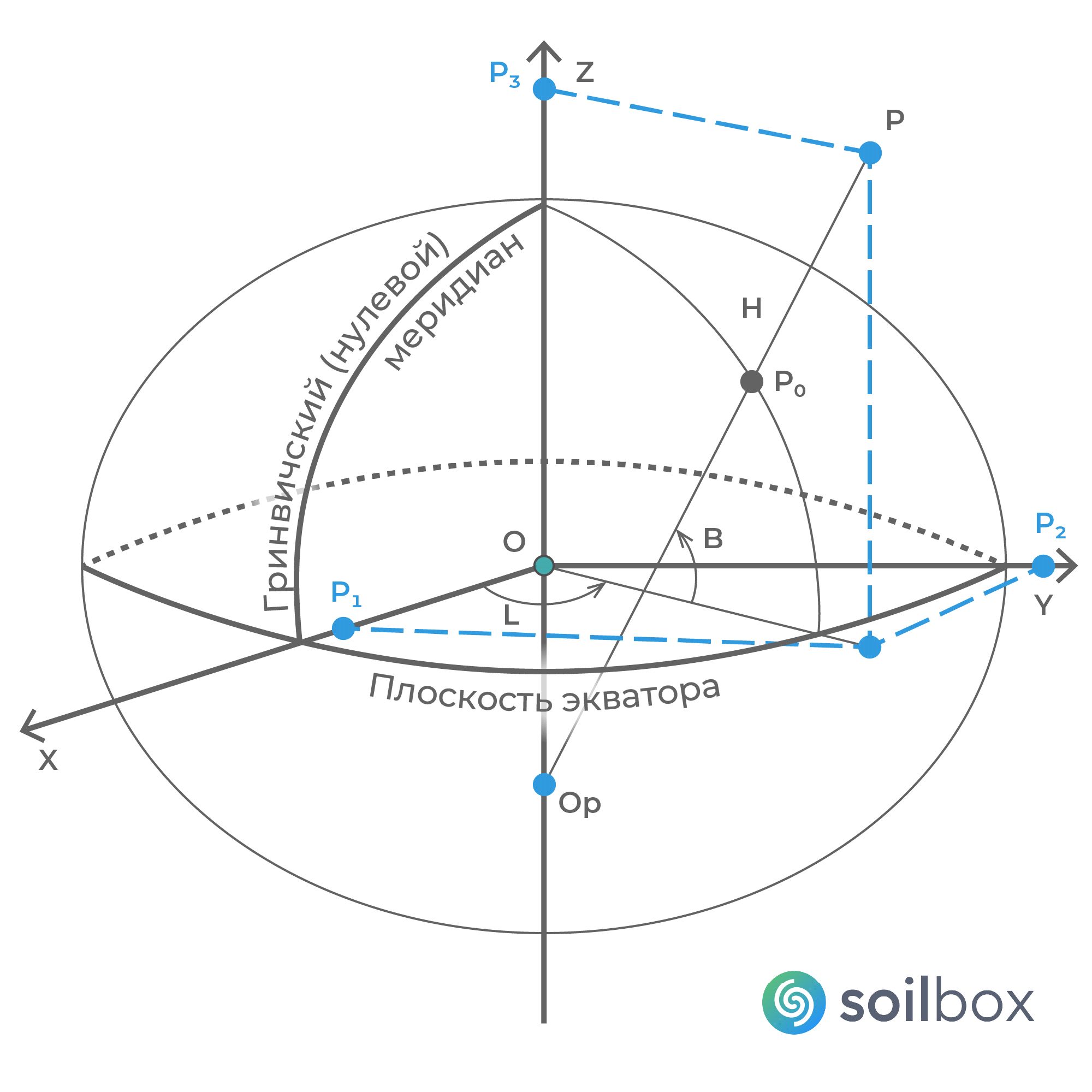 Положение любой точки пространства будет однозначно определяться тремя координатами (рис. 2): абсцисса равна отрезку ОР1 (Х = ОР1), ордината соответствует отрезку координатной оси ОР2 (Y = ОР2), а аппликата равна отрезку ОР3 (Z = ОР3). Данная система широко используется в спутниковых определениях положения точек, так как для ее применения не нужно иметь поверхность относимости (поверхность эллипсоида вращения), из-за чего отсутствует необходимость в редуцировании результатов полевых измерений на поверхность относимости (эллипсоид, сферу).