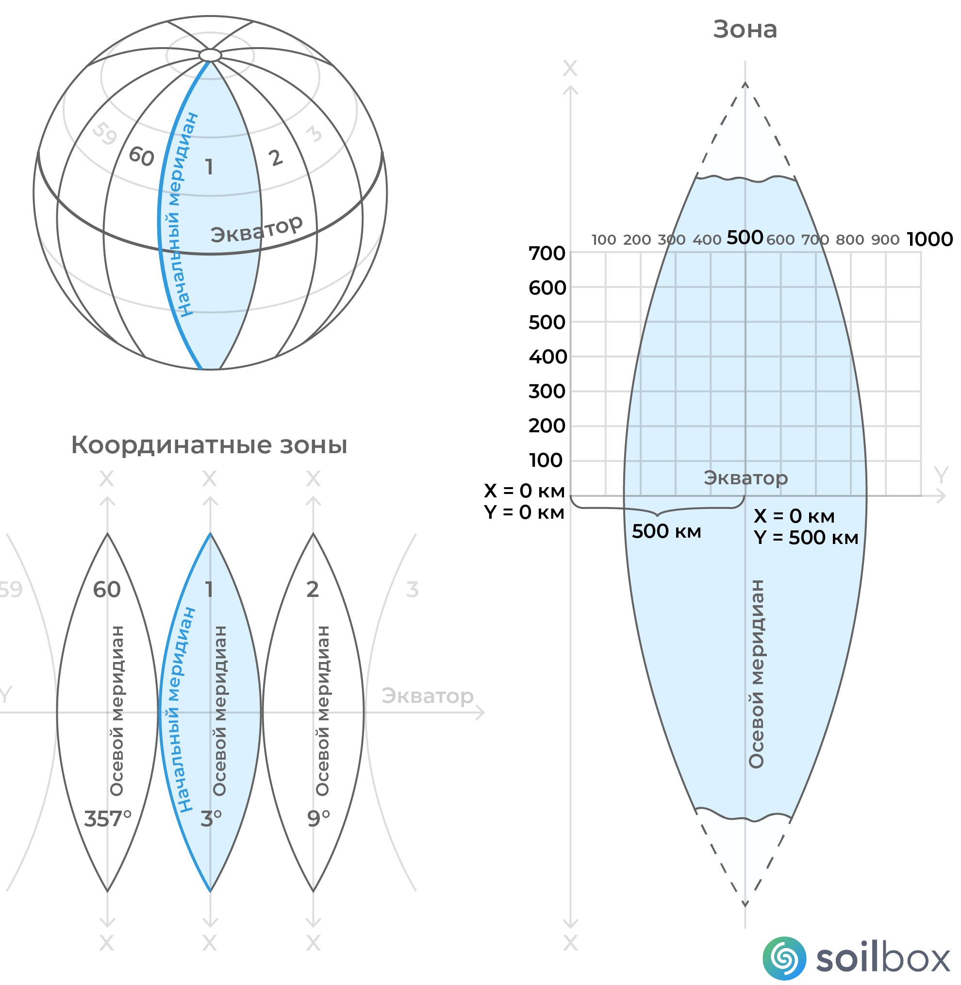 Рис. 4. Пример зональной поперечно-цилиндрической проекции Гаусса – Крюгера с шириной зоны 6°, сдвинутой на 500 км на восток