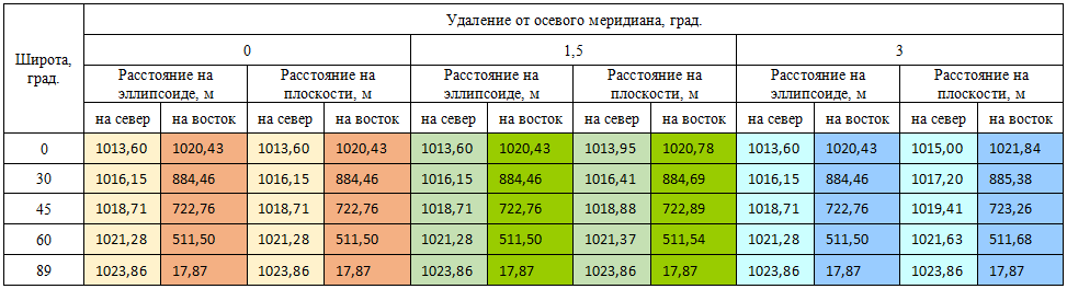 В сравнительной таблице 1 приведены значения длины дуги в 33 секунды на плоскости: на осевом меридиане и удалении на 1,5 и 3 градуса от него, а также на разных широтах (рис. 5).