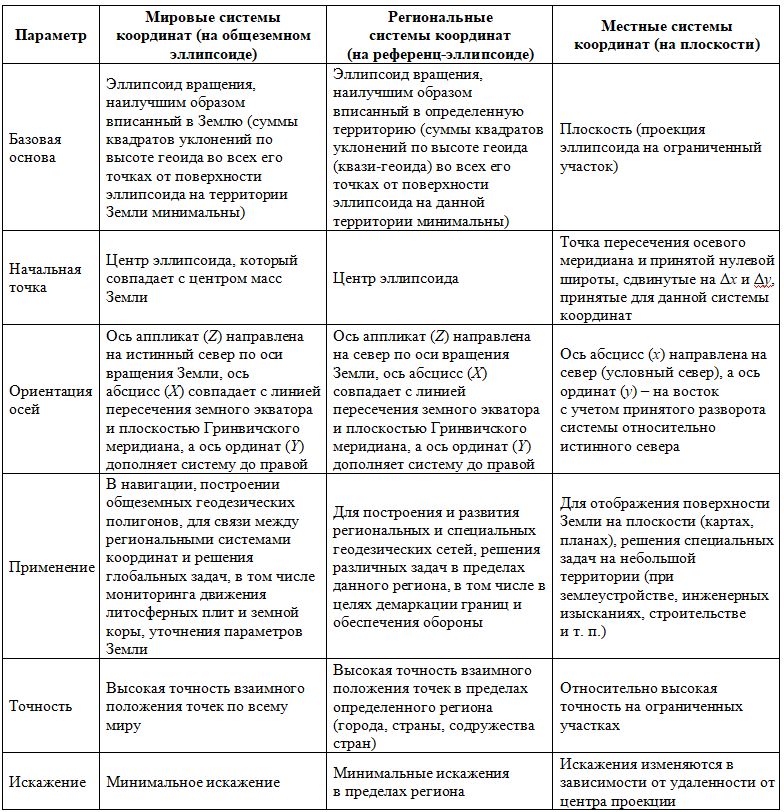 Чтобы структурировать представление о параметрах наиболее часто используемых координатных систем, в таблице 2 сопоставлены основные характеристики трех земных систем отсчета: на общеземном эллипсоиде (геоцентрические системы координат), на референц-эллипсоиде (региональные системы координат) и на плоскости (местные системы координат).