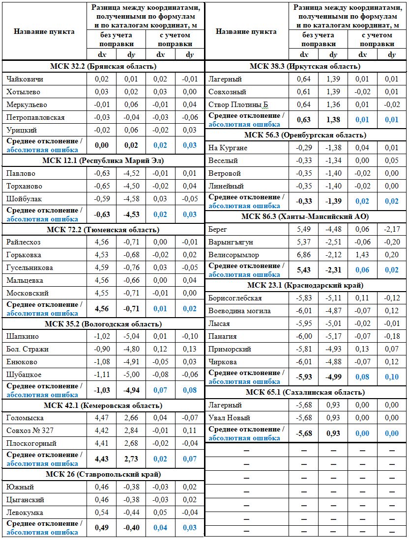 В таблице 5 представлены полученные данные по оценке точности параметров перехода. В столбцах под названием «без учета поправки» представлены разности между координатами, полученными по формулам и по каталогам координат. Эти величины зависят от: