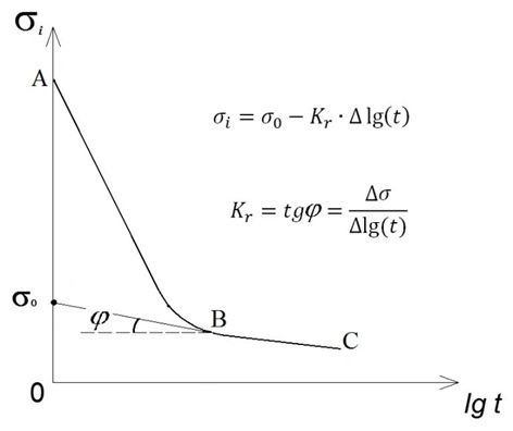 Первый участок графика релаксации связан с фильтрационными процессами и его, по аналогии с процессами консолидации, можно отнести к первичной релаксация; второй – с процессами ползучести, или вторичной релаксации. В общем виде кривая релаксации в координатах Ϭ = f (lgt) носит билинейный характер. Наиболее важным является второй участок, поскольку именно вторичная релаксация определяет падение напряжения в течение длительного периода времени.
