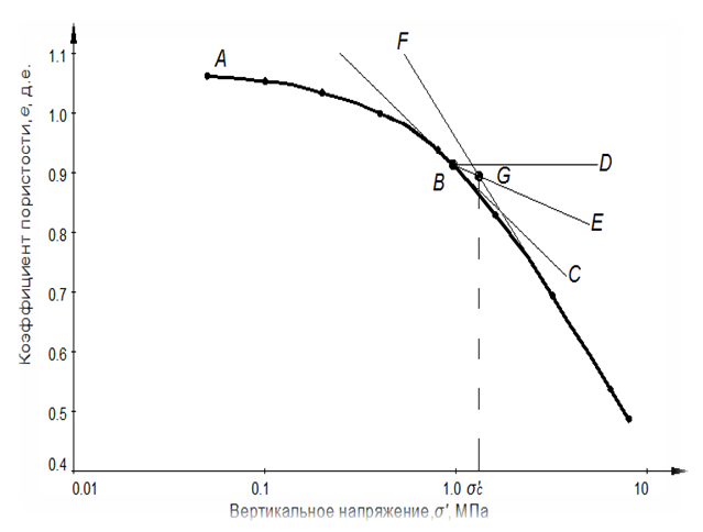 Рис. 8. Определение напряжения предварительного уплотнения по методу Казагранде