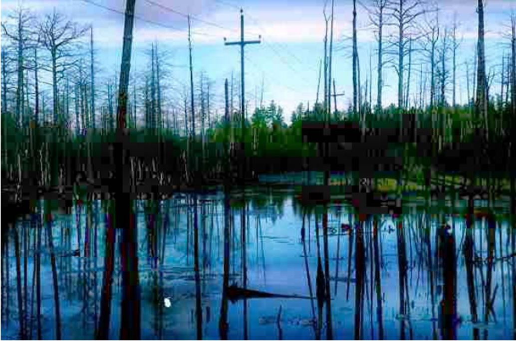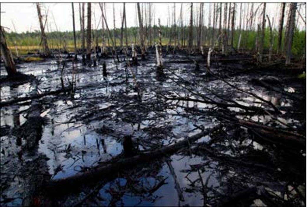 Рис.1. Гибель леса под воздействием «нефтяного озера» на Самотлорском месторождении в Западной Сибири (фото Е.А. Вознесенского, 1999)