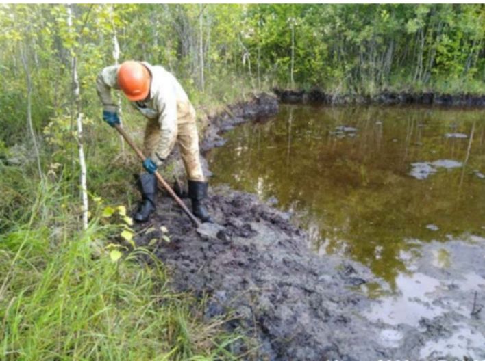 Наряду с механической срезкой нефтезагрязненного торфа на данном этапе проводится и сбор плавающей нефти на поверхности водоёмов. Данный этап проводится с помощью откачки насосами или вакуумными сборщиками нефти на территории, которую предварительно ограничивают по площади досками и бонами от дальнейшего растекания по водной поверхности (рис 5). Откачанная нефть затем загружается в специальные машины и отвозится на полигоны для утилизации. Результат проведенных работ обычно выглядит очень наглядно (рис. 6). Тем не менее, во время проведения работ необходимо также исключать вторичное загрязнение.