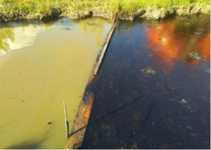 Рис. 6. Разница между частью водоема, где была произведена откачка жидкой нефти (слева) и местом, где еще не была произведена очистка (справа) (фото Королева В.С.)