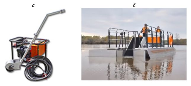 Рис. 9. Ручной щёточный скиммер-нефтесборщик «СОр» (а) и плавающий скиммер-катамаран КН-1 (б) (Королев, 2019)