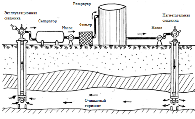 Рис. 10. Схема замкнутого цикла очистки водоносного горизонта от нефтяных загрязнений методом откачки в промывном режиме (Королев, 2019)