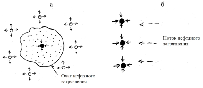 Рис. 11. Варианты применения откачки нефтяных загрязнений (план): а – локализация и удаление очага загрязнения системой нагнетательных скважин; б – перехват нефтяного потока системой скважин (Королев, 2019)