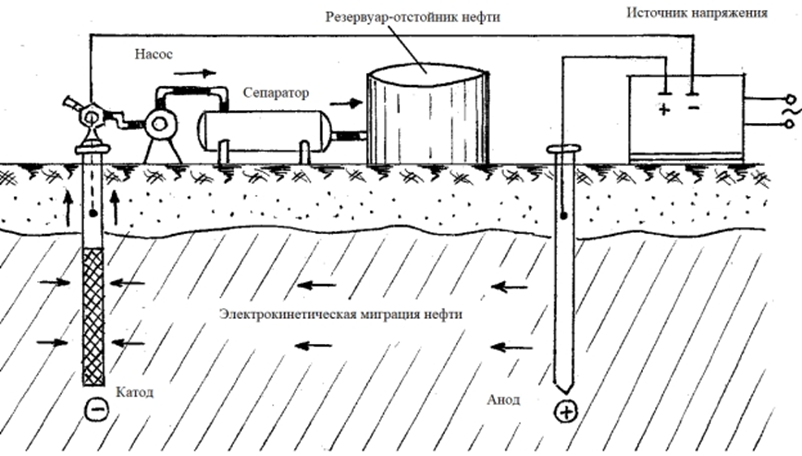 Электрокинетические методы основаны на применении поля постоянного электрического тока (Королев, 2023). Под действием приложенной разности напряжения в межэлектродном пространстве массива (между анодом и катодом) возникает электроосмотический поток воды от анода к катоду, вместе с которым в этом же направлении передвигается нефть или иные жидкие углеводороды (в том числе эмульгированные), увлекаемые силами вязкого трения (Королев, 2001). Этот метод применим для очистки от нефти к различным дисперсным грунтам – глинистым, суглинистым, супесчаным, торфяным, илам, а также к почвам.