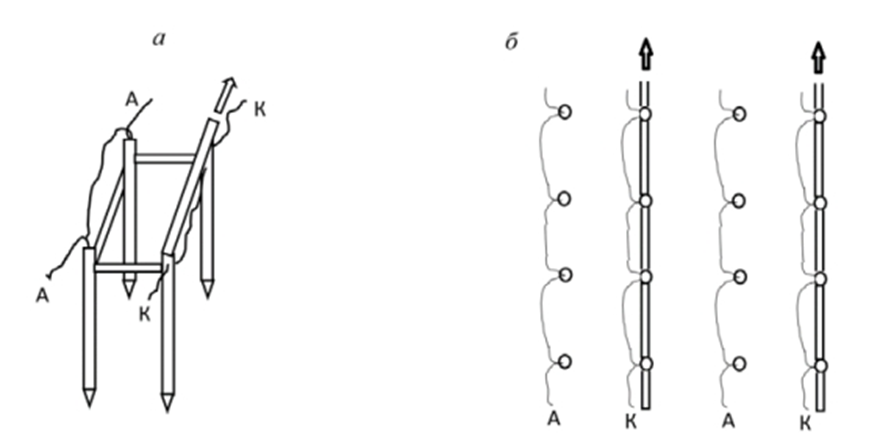 Для промышленной реализации этой методики на рабочей территории размещается система анодов и катодов. Учитывая незначительную глубину загрязнения, она состоит из блоков металлических анодных (А) и катодных (К) электродов (рис. 13, а), расположенных по секциям, которые задавливаются с поверхности, а затем соединяются друг с другом в единую сеть (рис. 13, б). Длина электродов до 50-60 см, т.е. соответствует глубине проникновения в торф нефти. Расстояние между электродами должно составлять от 1,5 до 2 м. Расстояние между рядами – до 2 м. Для катодных фильтров электроосмотических электродов применяются специальные пластмассовые трубы с дренажными отверстиями. Они соединяются гибкими шлангами. Откачиваемый электроосмотический фильтрат с углеводородным токсикантом собирается в сепараторе, затем проходит через систему фильтров.